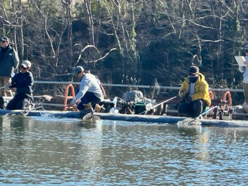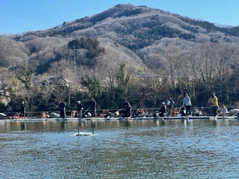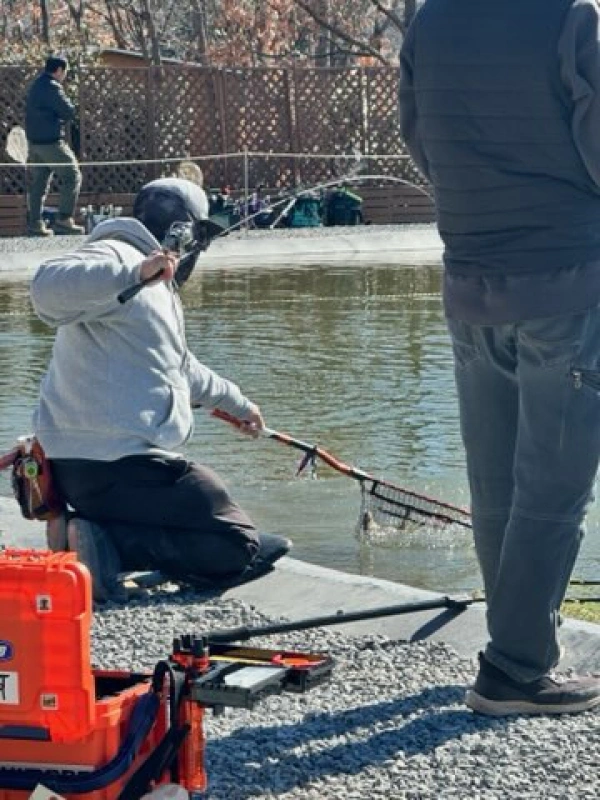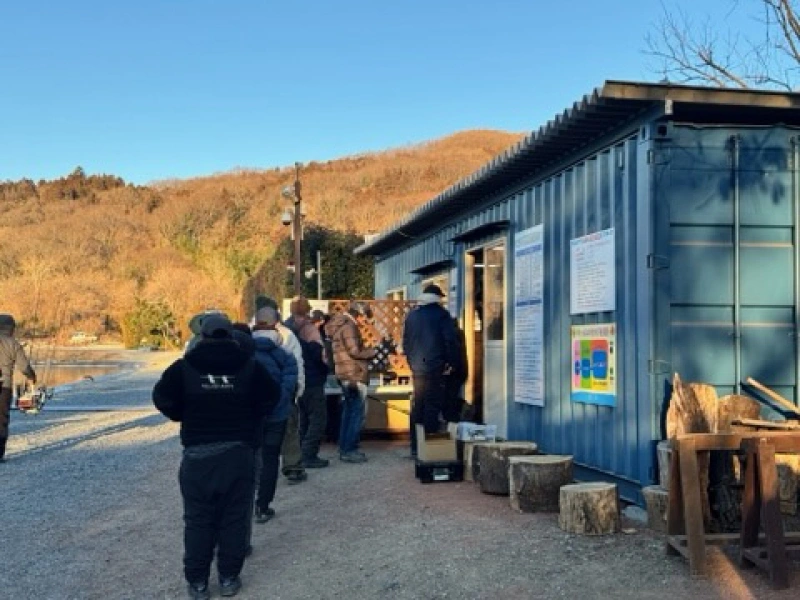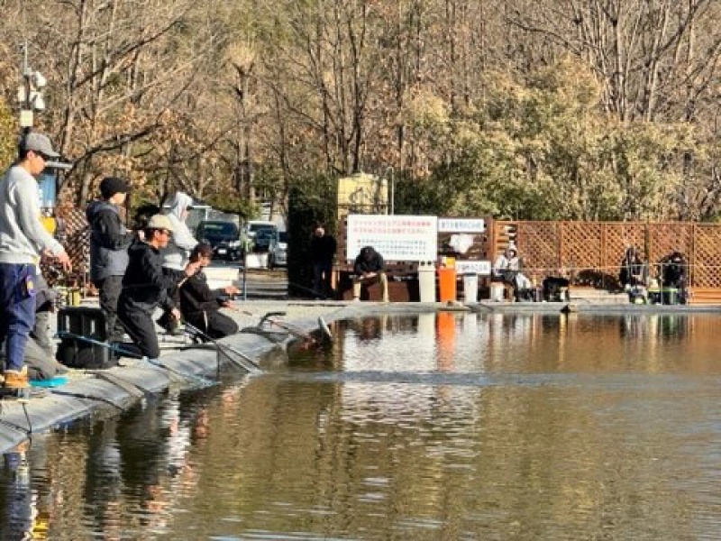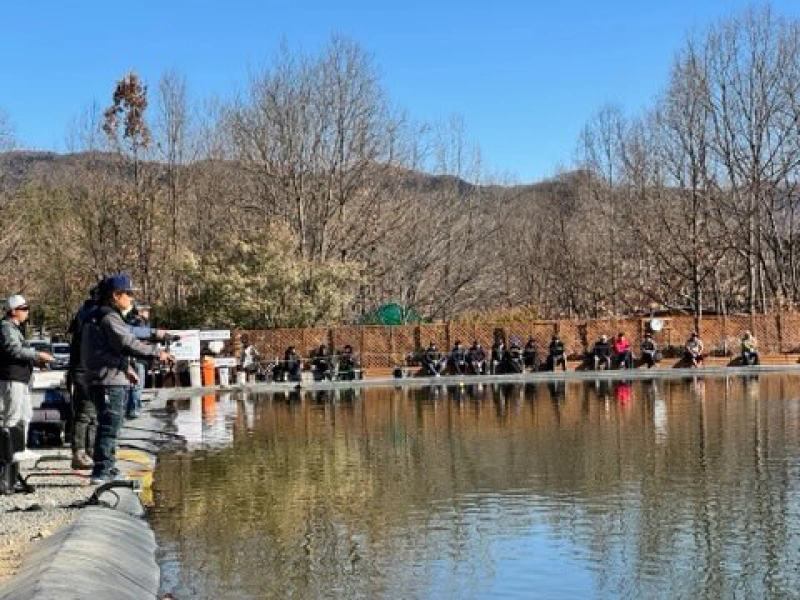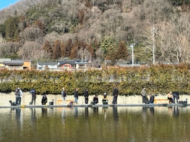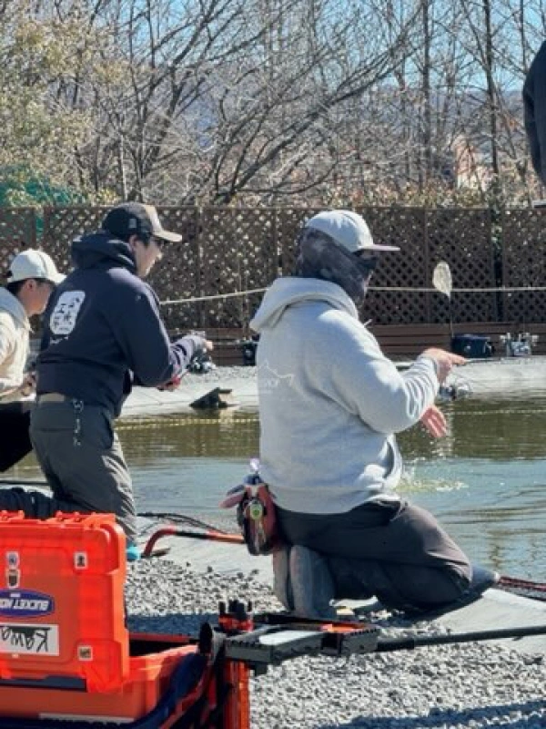 ポンドの一部には氷が張っており、釣座設営後には氷割りと破片の回収作業を実施