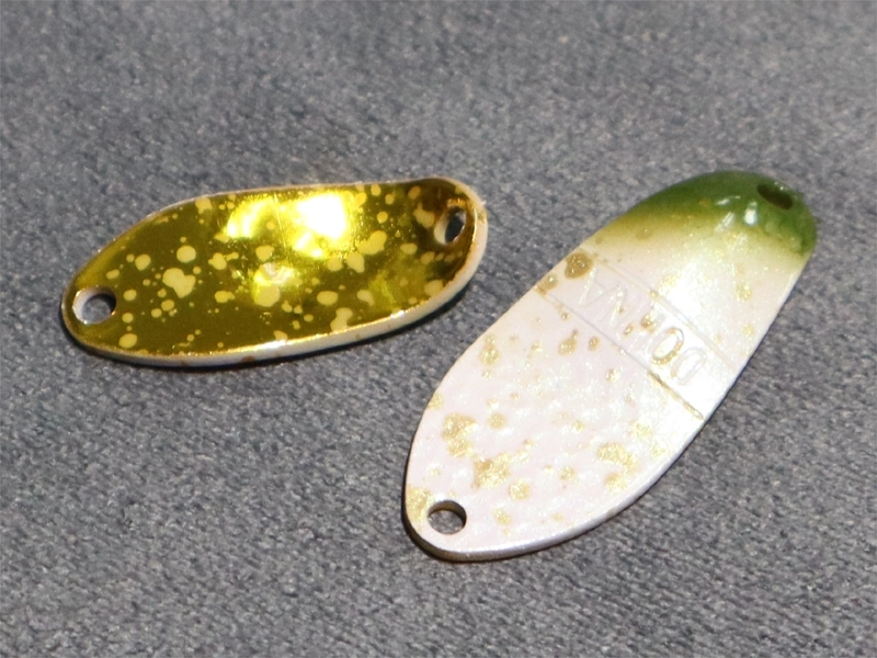 膨張色/金が効く状況で、膨張色だとトラウトから的が絞れず食い遊ばれるため、テールにオリーブに蛍光イエローを混ぜたカラーを配置しバイトマーカーに。