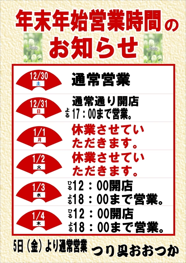 1月3日、4日は短縮営業。5日より通常営業とさせて頂きます。